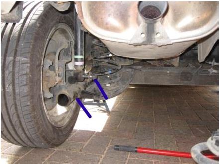 The rear is much simpler as you don’t need the spring compressors! You don’t need to take the wheels off either!!! Jack the car using the rear axle and once on the stands lower the axle slightly to take the load off the dampers and remove the bottom bolts.
