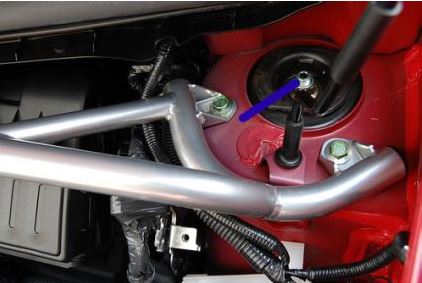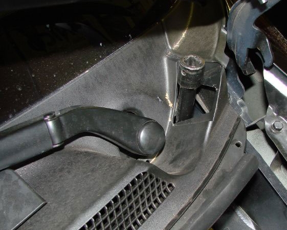 Once the wheel hub has been lowered safely onto the ground it’s time to move to the top of the strut. There are 3 bolts each side. 2 are visible in the engine bay and the third is below a little removable panel on the windscreen cowl. The front remove easily the rear you will either need a magnetic socket or, as I use, put the socket into the finger of a rubber glove as that takes out the tolerance and holds the nut nicely!