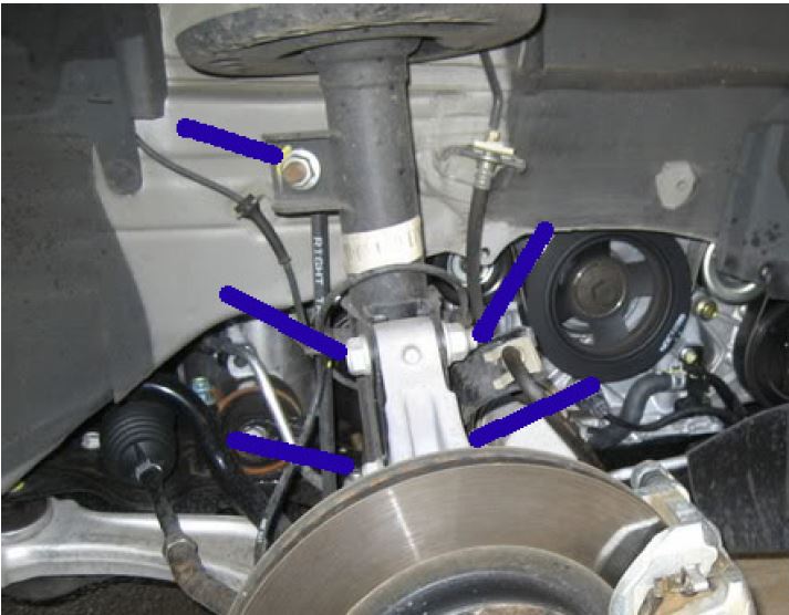 Blast the damper top nuts and the pair of lower wishbone connection bolts at the front each side and the lower damper connection bolts either side at the rear with penetrating fluid a few days before you intend to work and then the morning of the job. This is advisable as everything can get a bit stuck with the dreaded Japanese super glue… rust! The points marked with blue are the locations to spray, the rear was already undone when the picture was taken but you can see the oil in the shot!