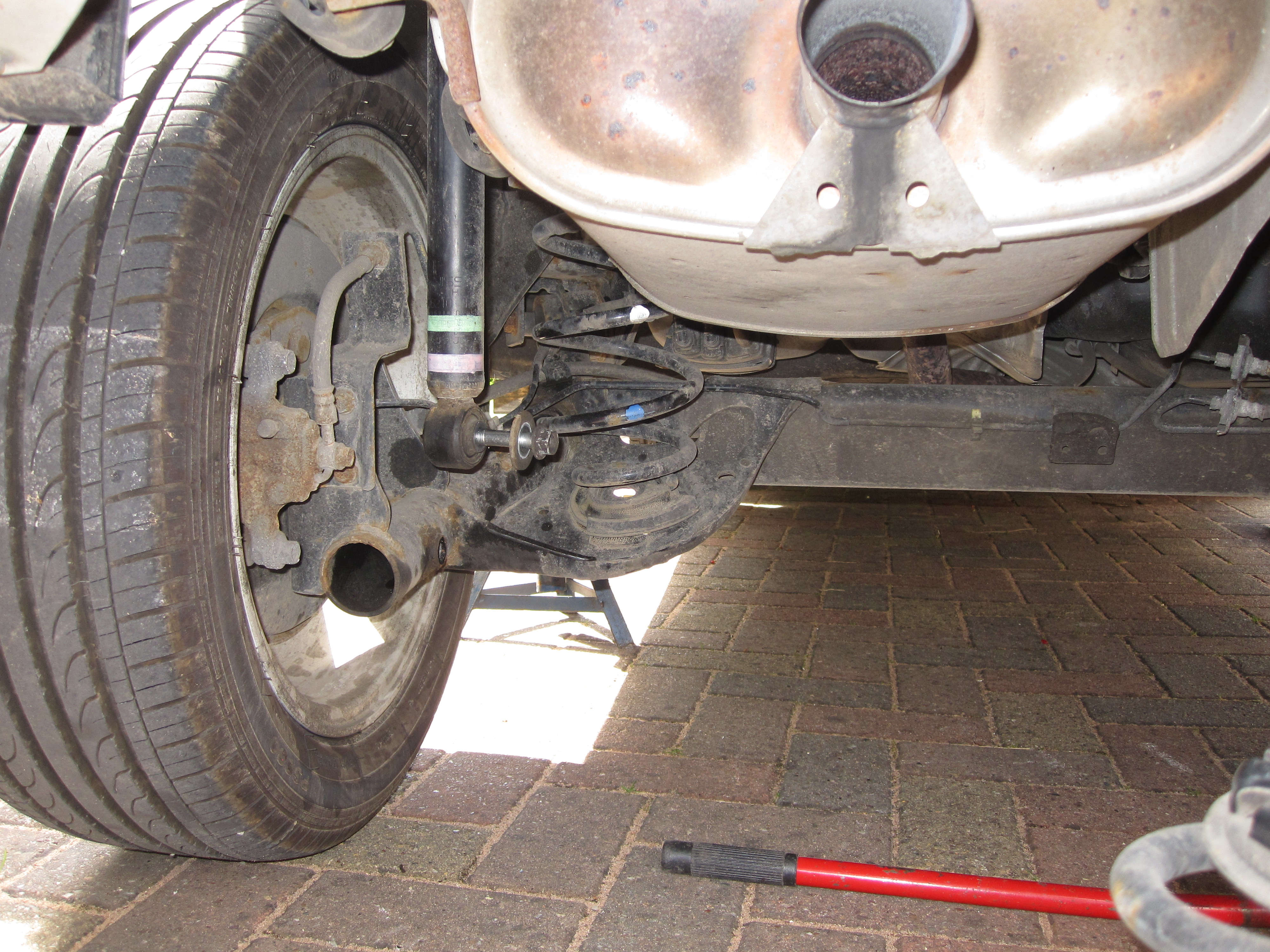 First task is getting the car in the air. I’d advise you start with the front; it’s the larger part of the work and also has the more bolts and nuts to have seized and make you have to stop! Make sure the car is chocked at the rear and the axle stands are ready to slot under the car.